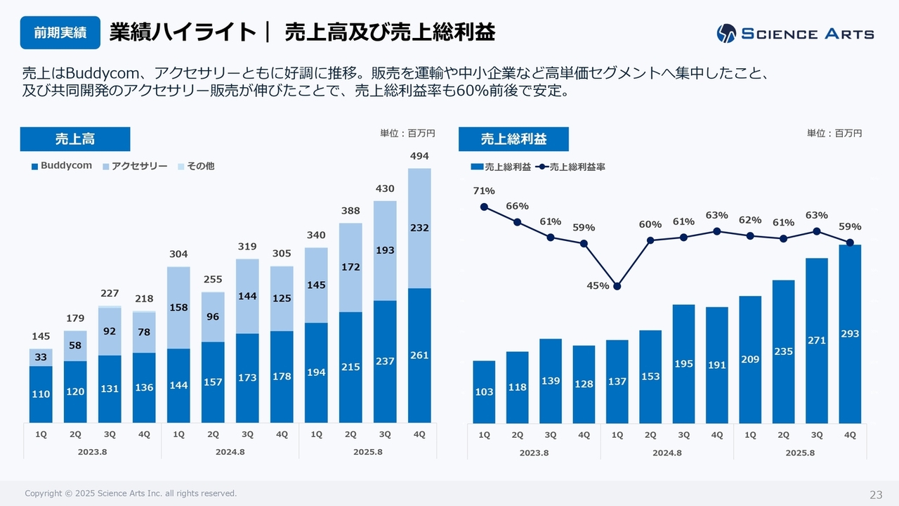 売上高および売上総利益についてです。売上高は順調に推移しており、売上総利益率も60パーセント前後と非常に安定しています。第4四半期については59パーセントとなりましたが、これは大型受注に伴い若干のボリュームディスカウントが適用されたためで、ポジティブな結果です。