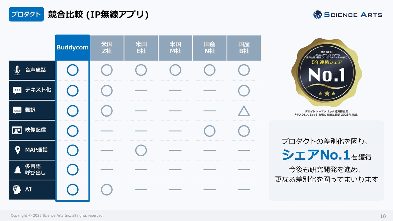 スライドは競合と比較したIP無線アプリの特徴です。一目瞭然で、「Buddycom」は多彩な機能、特にAI機能やマップ機能、映像配信などが大きな強みとなっており、シェアNo.1という位置づけにあると考えています。
