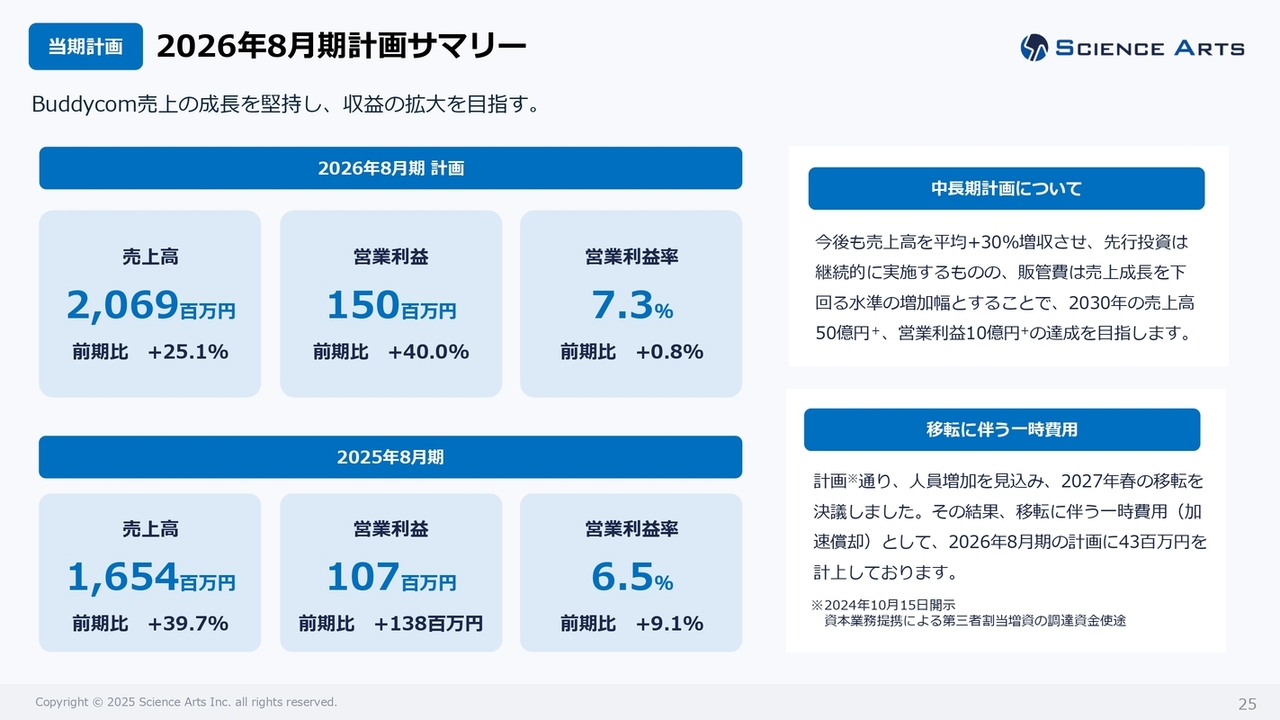 また、今期は人員増加に伴う移転を見込んでおり、移転費用として4,300万円を計上していますが、営業利益はこれを加味した計画です。