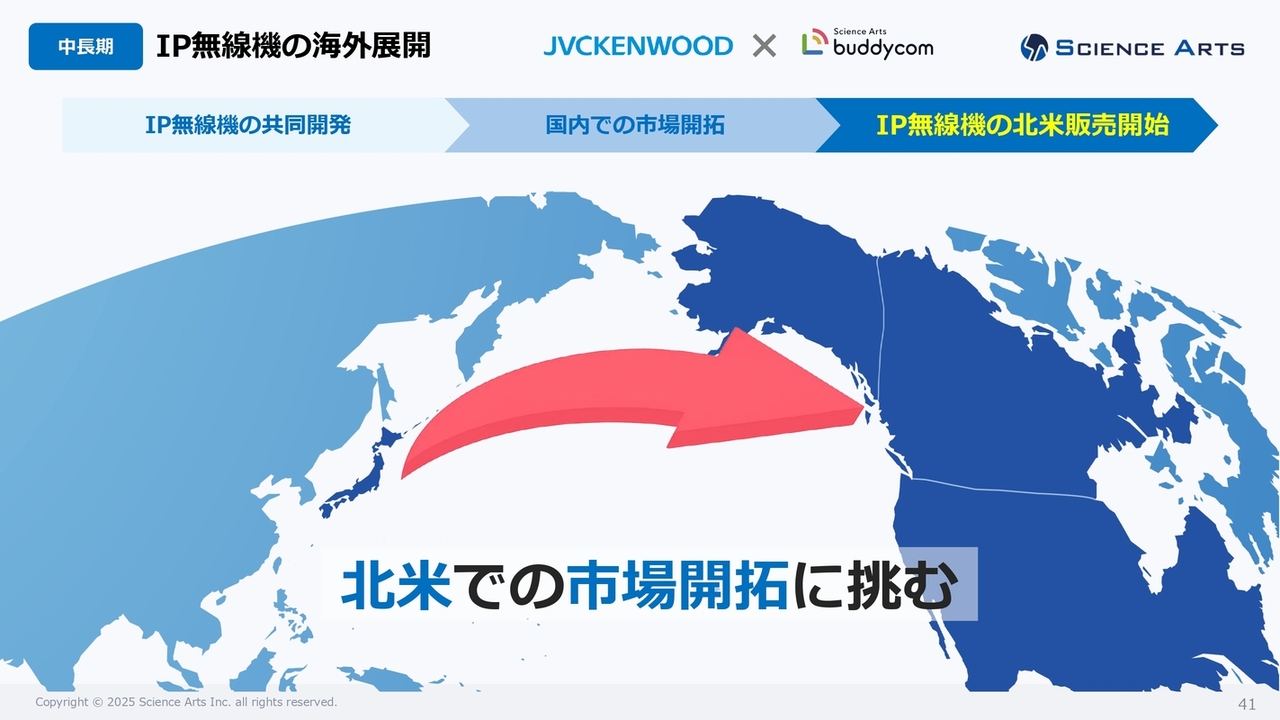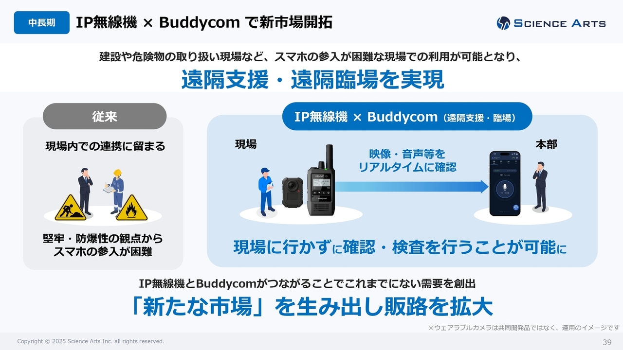 新しい市場開拓についてです。建設現場や危険物の取り扱い現場、土木作業など、スマートフォンの利用が困難な環境でも使用可能な遠隔支援・遠隔臨場を実現するために、「IP無線機×Buddycom」というかたちでこれらのマーケットに参入していきます。新たな市場を創出し、販路を拡大していく方針です。