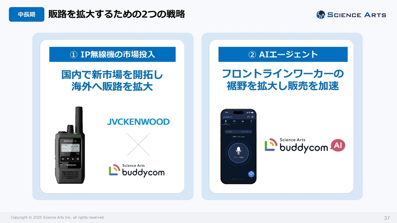 販路を拡大するための2つの戦略についてお話しします。1つ目は、IP無線機のマーケットへの進出です。当社はJVCケンウッドと資本業務提携を行っており、JVCケンウッド製の無線機に「Buddycom」をそのまま組み込むようにします。スマートフォンではなく無線機として「Buddycom」を販売していく計画です。