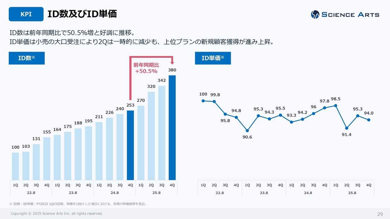 ID数およびID単価についてです。ID数は前年同期比50.5パーセント増と順調に推移しています。ID単価はボリュームディスカウントで若干下がっていますが、90パーセント以上を維持しています。