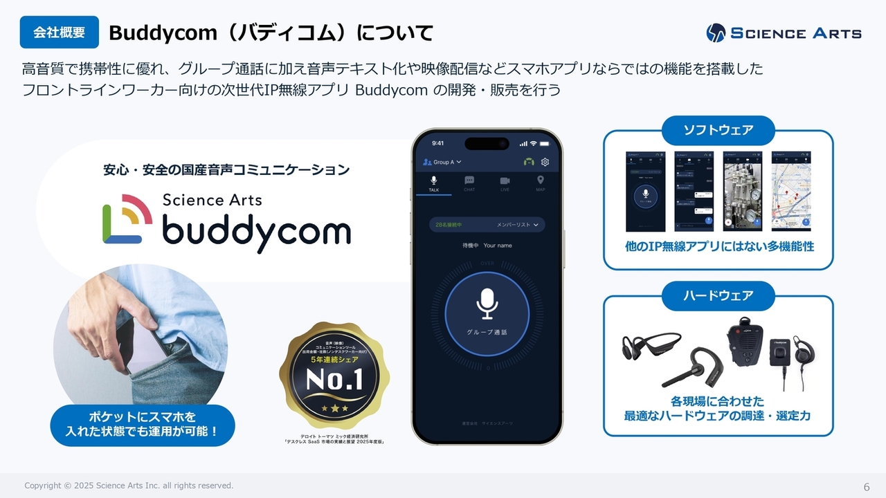 「Buddycom」という製品についてです。当社はサブスクリプションモデルを採用するメーカーで、ソフトウェアだけでなくハードウェアも開発して提供しています。これにより、ソフトとハードの両面からフロントラインワーカーのみなさまを支えています。