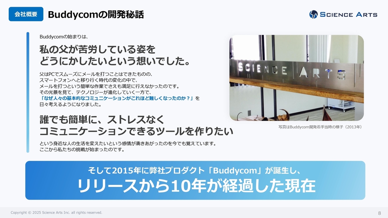 当社は2003年に設立しました。当初は資金がなく、コンサルティング業務を行っていました。しかし、コンサルティングがなかなか安定しなかったため、データベース事業にも取り組みました。その結果、開発資金にある程度の余裕が生まれました。そして、2014年に方向転換を行い、「Buddycom」の開発に注力し、そこに投資を続けてきました。