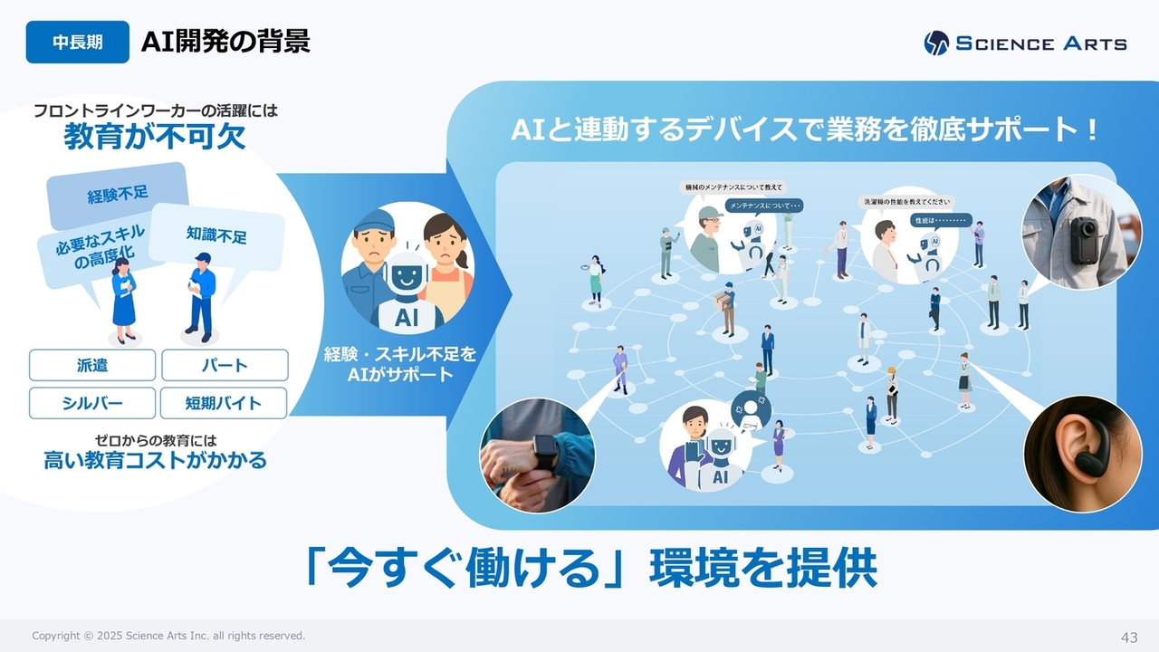 また、採用する側でも人手不足が課題となっています。これに対しては教育コストを削減するために、働く人にAIを提供して教育コストを抑え、現場の教育や監督のリソース不足に対してAIで支援するなど、AIを活用した現場のサポートを強力に推進していこうとしています。