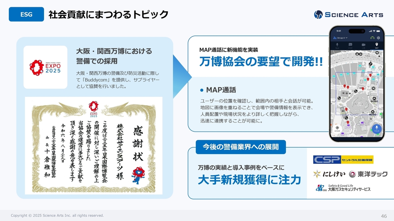 社会貢献に関連するトピックとして、「大阪・関西万博」は残念ながら終了しましたが、この期間中、警備に採用され、場内警備にご利用いただきました。また、日本国際博覧会協会の要望により開発した、MAP通話の新機能では、外部には公開していない会場の地図を活用し、警備の安全性を高める特別な機能も提供しました。
