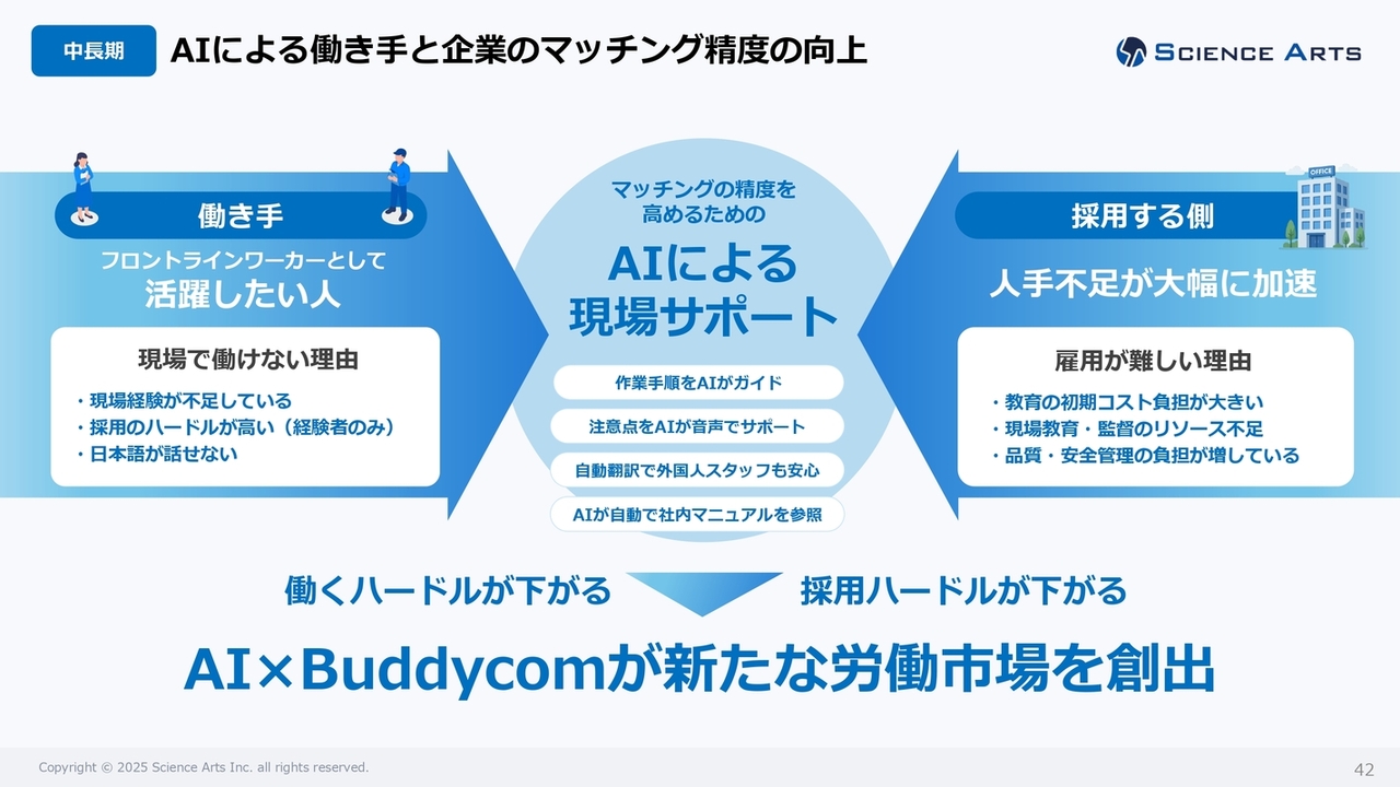 「AI×Buddycom」により、新たな労働市場を創出できればと考えています。働きたい人と採用する側とのマッチングを、これから強力に押し進めていきます。