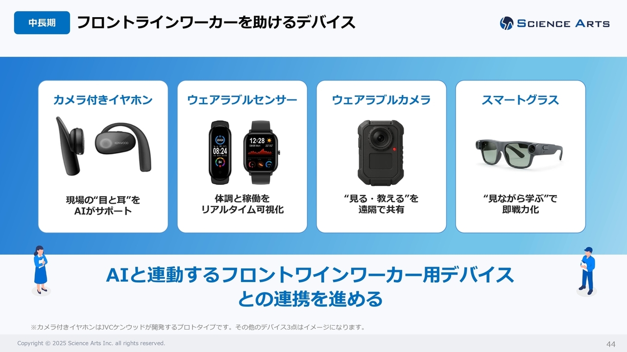 フロントラインワーカーを支援するためのデバイスも多く開発を進めています。カメラ付きイヤホンは「CEATEC 2025」でも展示しています。今後、ウェアラブルセンサーなど、さまざまなデバイスとAIを連動させ、フロントラインワーカーの支援に活用していく考えです。