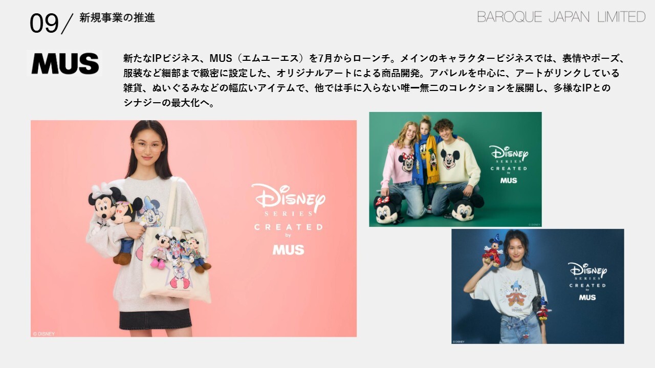 新規事業「MUS(エムユーエス)」についてご説明します。これは、バロックが取り組む新たなIPビジネスです。「MOUSSY」「SLY」など、従前から取り組んできたディズニーキャラクターを活用したアパレル開発を手始めに、今後はディズニー以外のIP、さらには自社独自のIP開発も含めた展開を加速していきます。将来的には3桁規模の事業に成長させることを目指し、現在、周到な準備を重ねて事業を推進しています。