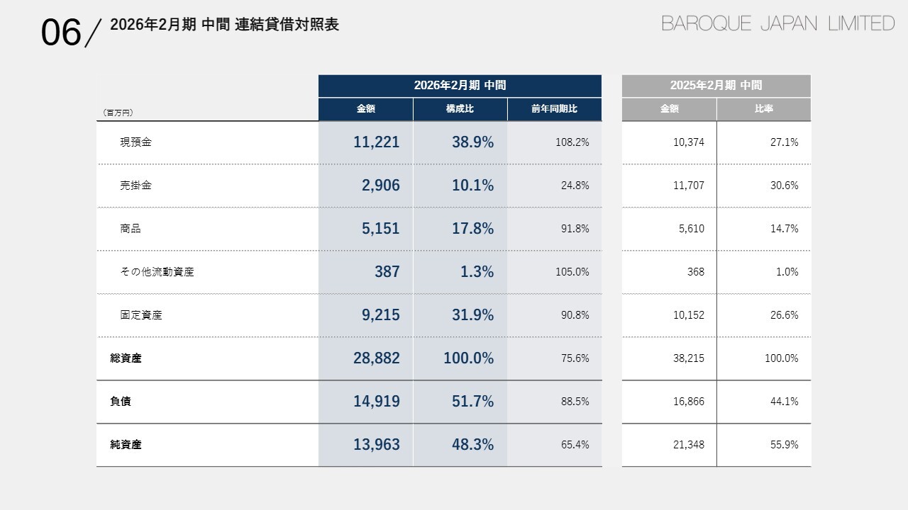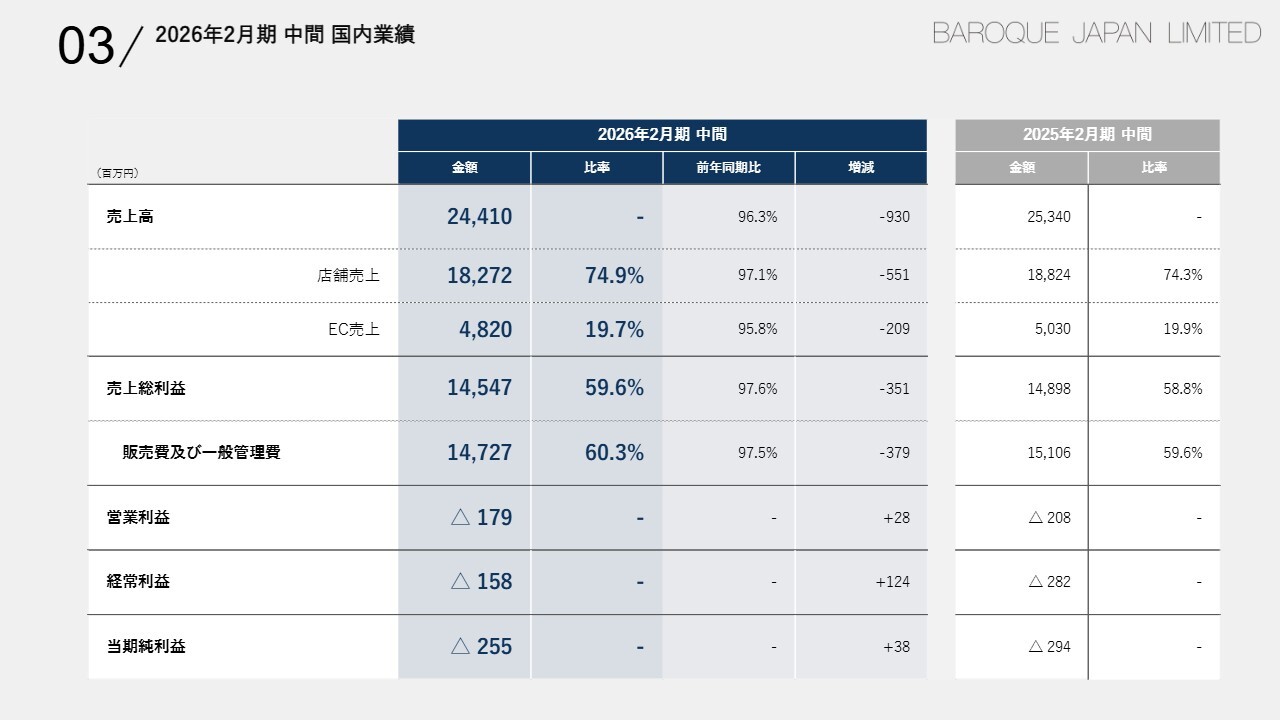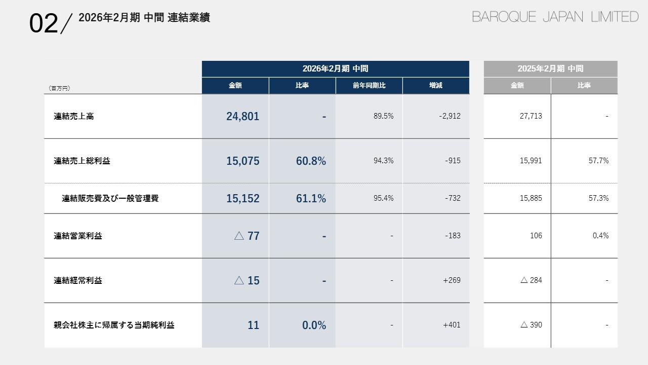 関達也氏:経営企画室室長の関です。初めに私から、2026年2月期の中間決算についてご説明します。連結売上高は248億円、前年同期比89.5パーセント、連結売上総利益は150億7,000万円、前年同期比94.3パーセント、連結営業利益はマイナス7,000万円、親会社株主に帰属する当期純利益は1,000万円となり、前年同期から黒字に転じました。