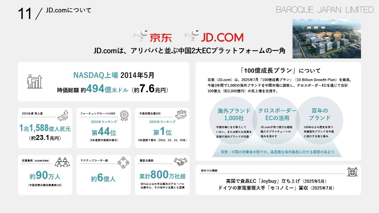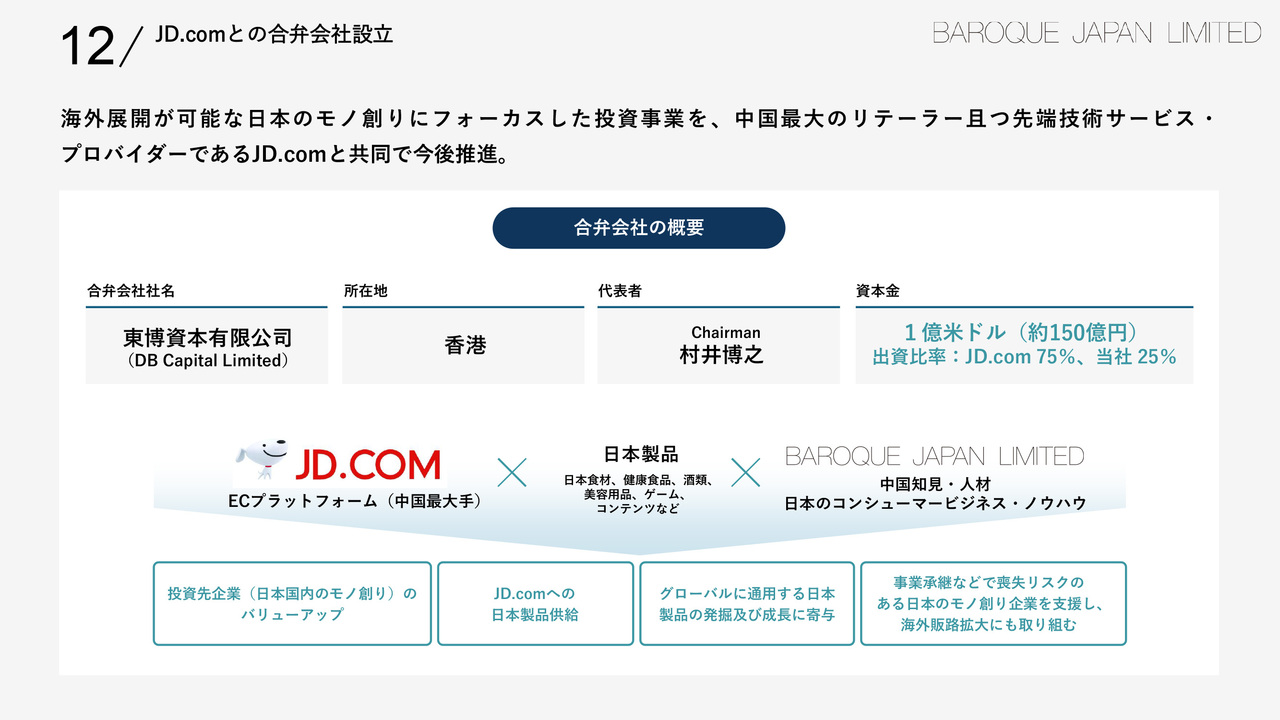 バロックの新たな取り組みについてです。既存のアパレル事業とはまったく異なる事業を、中国最大手のEC企業であるJD.comと合弁で開始します。