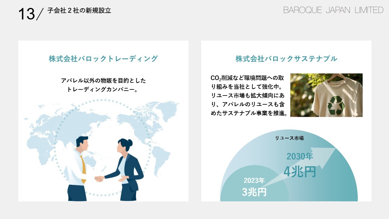 バロックが100パーセント出資し、新規設立する子会社2社についてです。1つは、バロックトレーディングという会社です。バロックの商品を調達するのではなく、アパレル以外の物販を目的としたトレーディングカンパニーです。先ほどご説明した、DB Capital LimitedやJD.comとの合弁投資会社の活動を支援する意味も込めて、我々自身で独自のトレーディング会社を設立するに至りました。