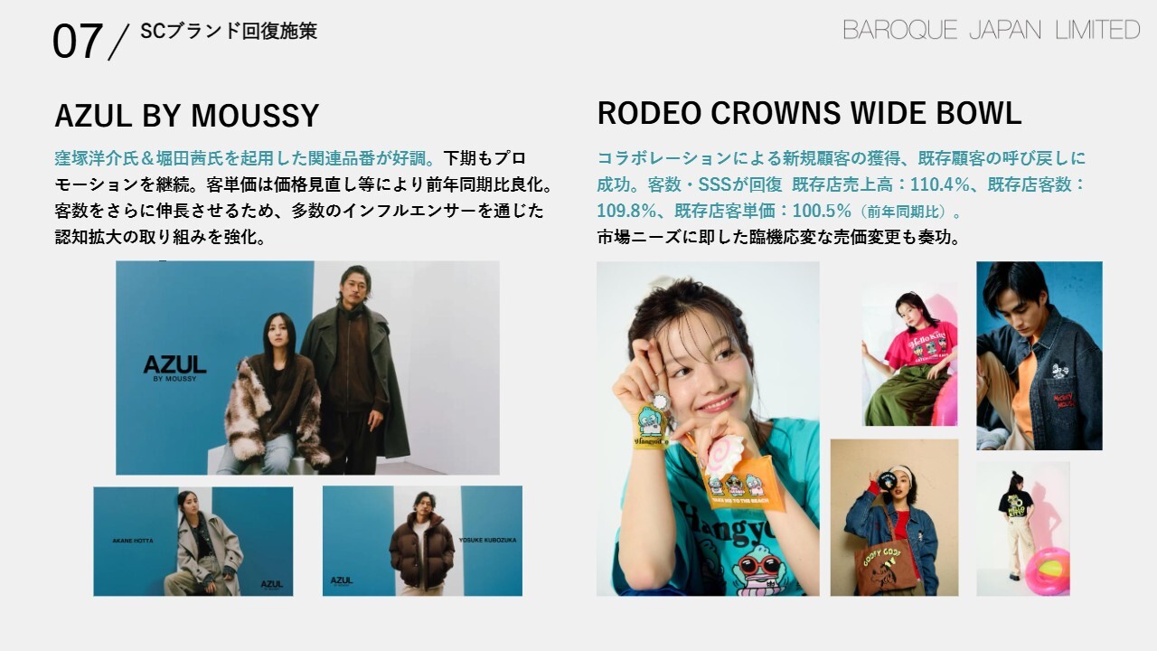 バロックのSCブランドは、全体的に機動的な価格変更が苦手であり、それが弱点となっていました。プロパー価格での販売にこだわり、セール期間が少ないため、コロナ禍後のSCブランドは大きく苦戦を強いられました。しかし今回、「RODEO CROWNS WIDE BOWL」が臨機応変な売価変更で成果を上げたことを受け、「AZUL BY MOUSSY」についても、SCモールブランドに適した戦略で数字を伸ばしていきたいと考えています。