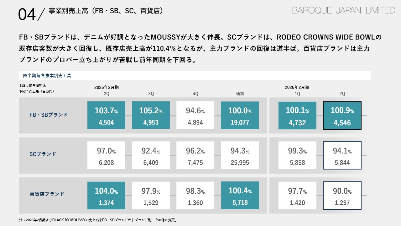 一方、SCブランドは、「RODEO CROWNS WIDE BOWL」の既存店売上高が前年同期比で2桁成長を遂げましたが、主力の「AZUL」の客数減が影響して前年同期を下回りました。百貨店ブランドは、主力ブランドのプロパー立ち上がりが苦戦し、前年同期を下回りました。