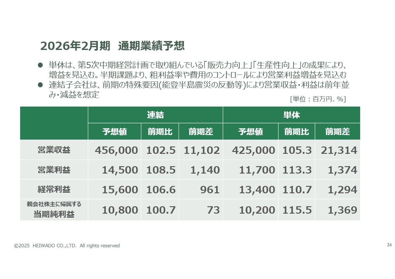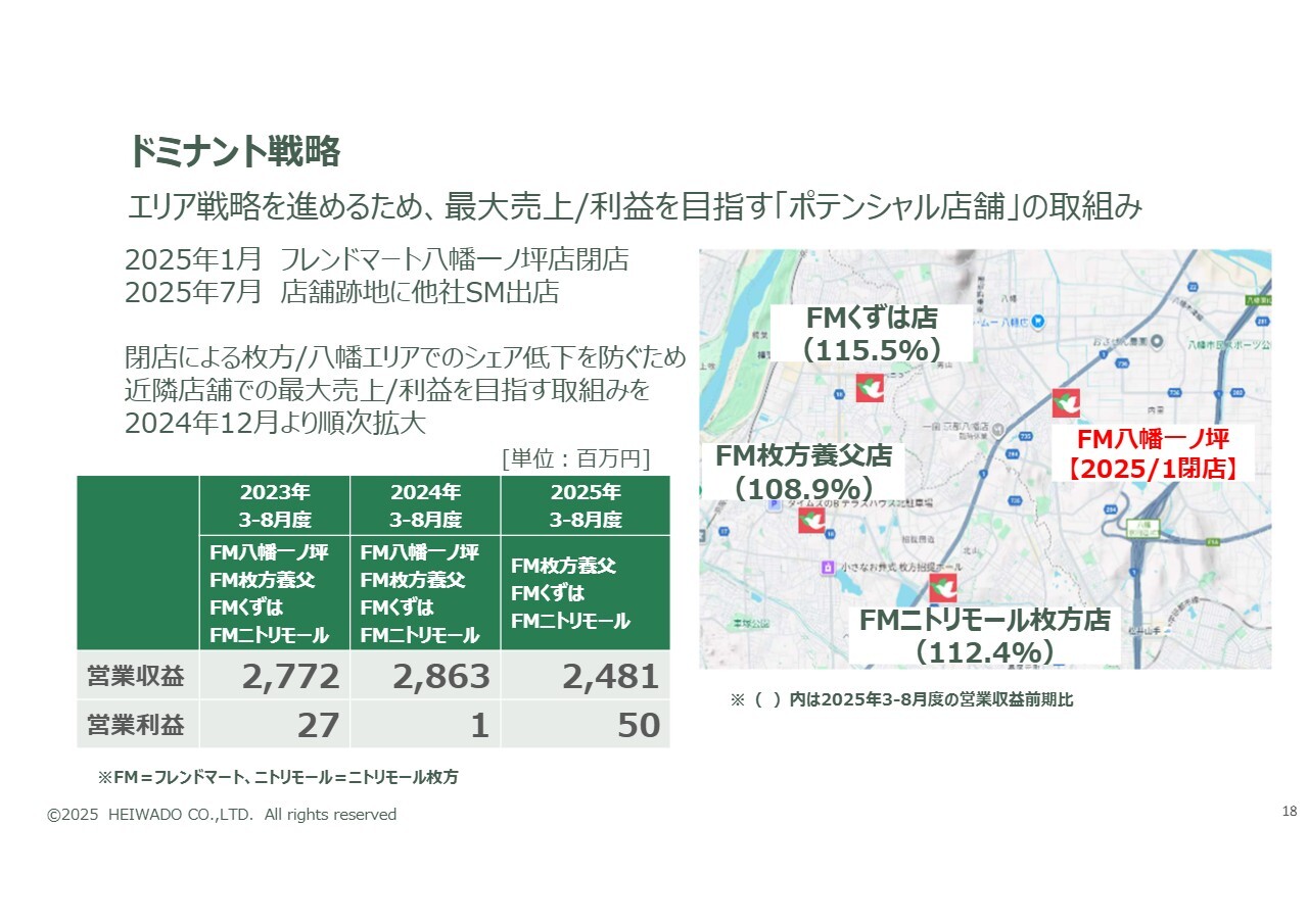 そのような中、今回「フレンドマート八幡一ノ坪店」を閉店した影響で、2025年度の営業収益は24億8,100万円となりました。一時的に減少していますが、もともと「フレンドマート八幡一ノ坪店」の年間売上は約11億円から12億円で、半期ではおよそ6億円の売上を上げていた店舗でした。周辺の店舗でその分を吸収し、売上を上げていこうということで動いています。