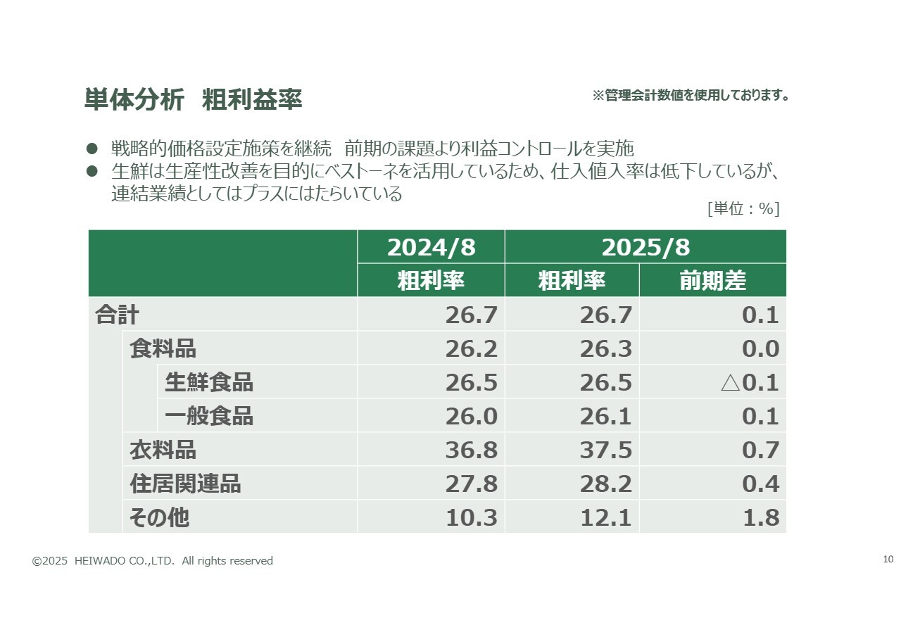 生鮮食品については、前期よりも低い数字となっています。この中には、生産性向上を目的として食品製造業のベストーネを活用したことにより、仕入値入率が低下している影響も含まれています。ただし、こちらは単体の数字であり、連結子会社であるベストーネと合わせた全体としては、利益面でもプラスに寄与しています。