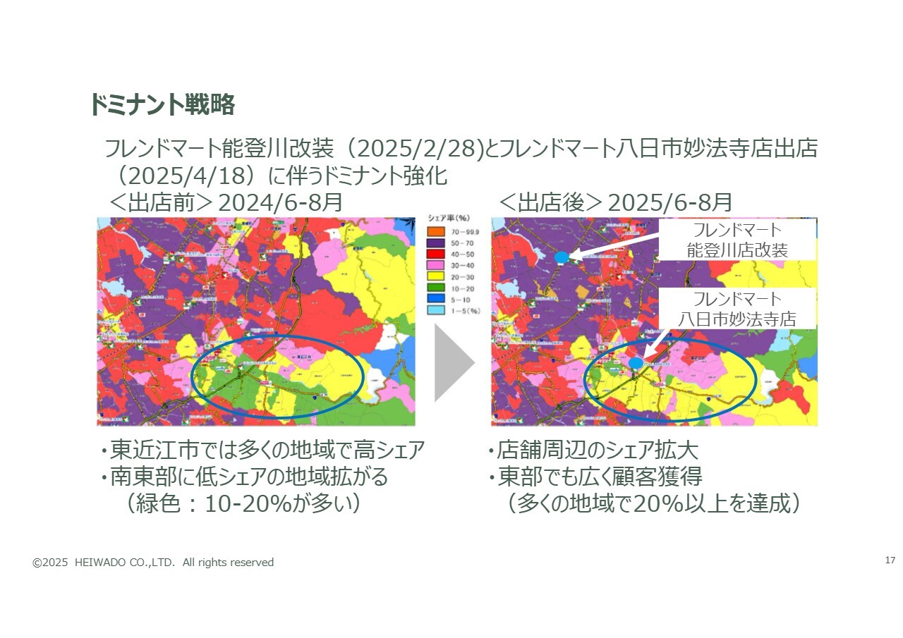 2つ目は、シェアが低いエリアに対する、新店舗「フレンドマート八日市妙法寺店」の出店です。この出店によって緑色だった部分が黄色のシェア率20パーセント以上に上がり、さらに黄色だった部分がピンク色のシェア率30パーセント以上に上昇するなど、エリア全体のシェア率を引き上げることができました。