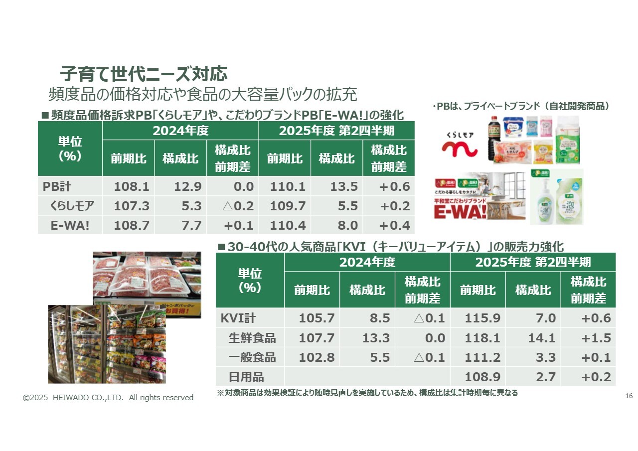 さらに「KVI(キーバリューアイテム)の販売強化」という取り組みがあります。30代から40代の方に人気の商品をピックアップし、その商品についての価格対応を行ったり、容量を増やしたりしています。こちらの取り組みにより第2四半期の構成比の数字も伸びています。