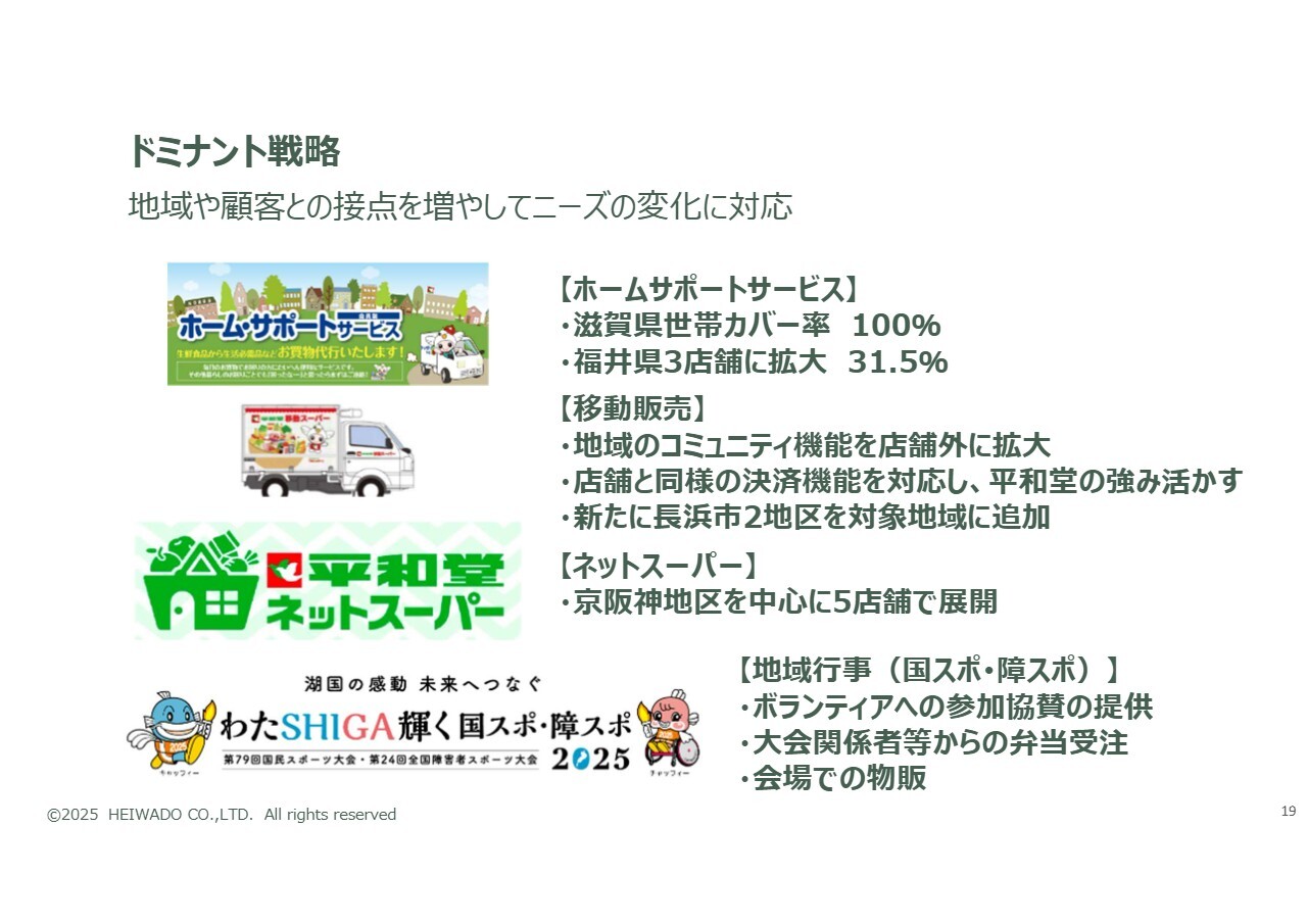 「ホームサポートサービス」は、電話やFAXで午前中にご連絡いただければ、夕方までに商品をお届けするサービスです。滋賀県内の全世帯、100パーセントをカバーしています。福井県でも展開しており、約3割の世帯をカバーしています。このようなサービスをさらに広げていきます。