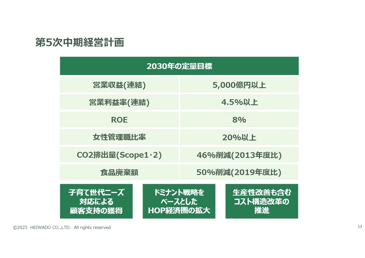 具体的には、子育て世代のニーズに応える各施策の実施、ドミナント戦略を基盤とする「HOP経済圏」の拡大、さらに生産性向上を含むコスト構造改革を推進しています。