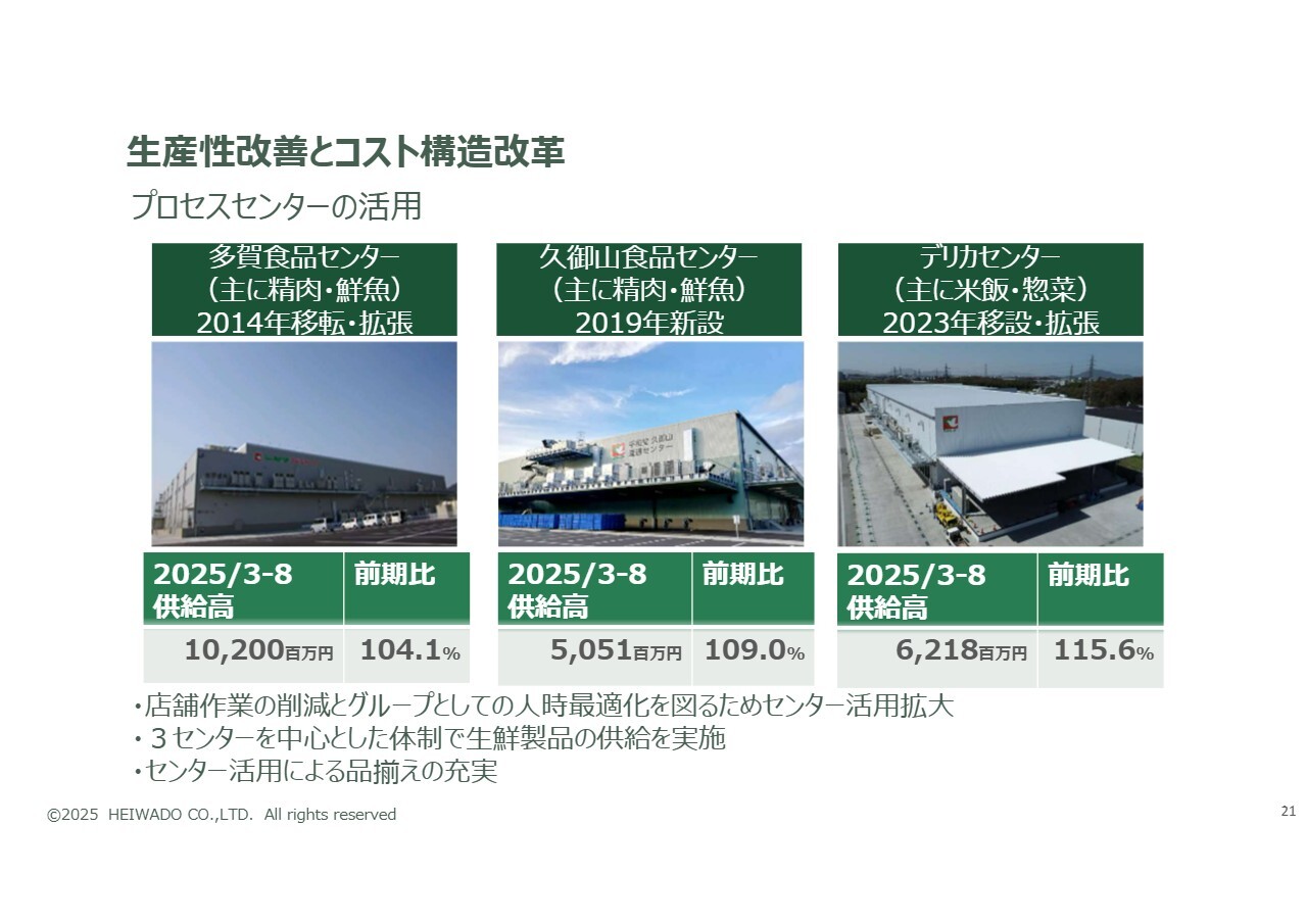 重点戦略の3つ目、生産性改善とコスト構造改革についてです。重要なポイントとしてはセンター活用があります。