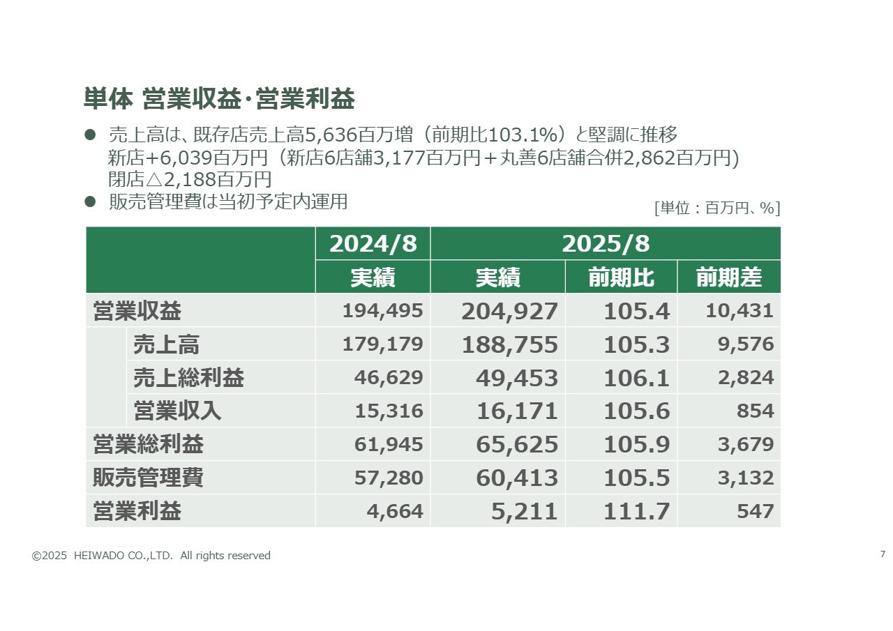 単体の業績についてご説明します。単体についても増収増益です。売上高が増収となった主な理由として、既存店の売上高前期比が103.1パーセントと非常に堅調に推移し、約56億円増えたことと新店の売上が約60億円増加したことが挙げられます。