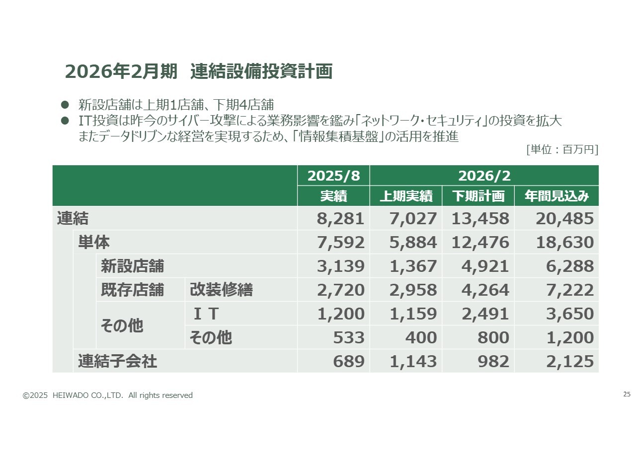 投資計画も年度初めに計画した内容で進めています。投資のタイミングは年度中で前後したり、上期・下期で一部変更があったりしますが、基本的にはスライドに示すとおりに進める方針で調整しています。特に今回の投資では、先ほど触れた新店や改装のほかに、IT分野が大きなポイントとなっています。