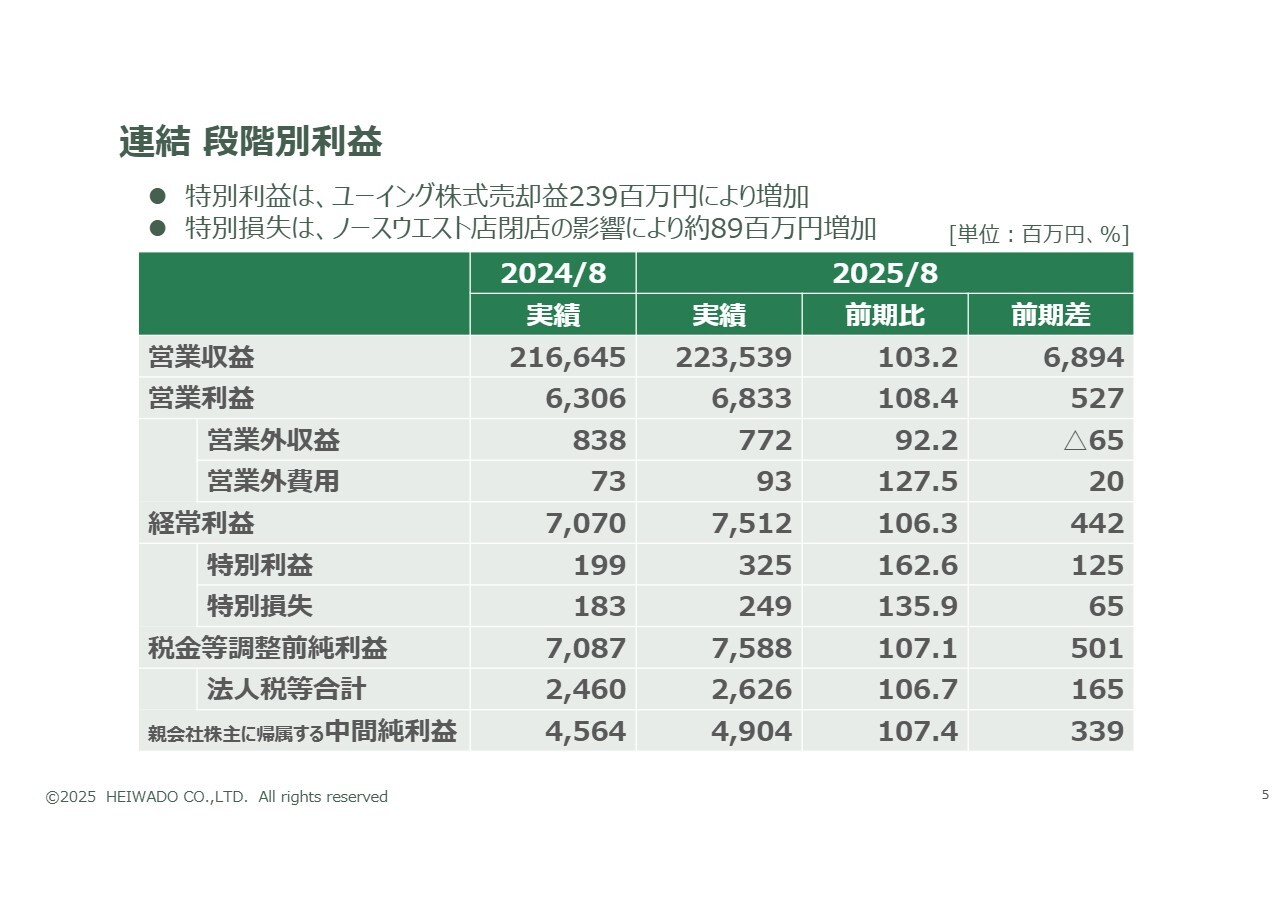 特別損失については、岐阜に所在していた「平和堂ノースウエスト店」の閉店の影響により約9,000万円の増加となりました。