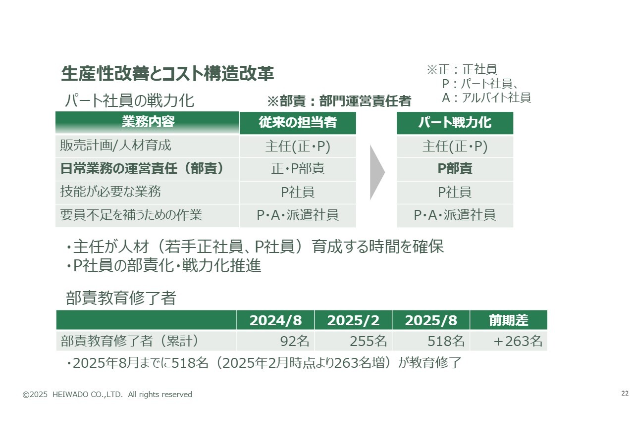 スライド下段に人数が示されているとおり、昨年の同時期には部門教育修了者が100名弱でしたが、現時点では約500名となり、この部分の強化をさらに進めていきたいと考えています。パート社員から主任へ、さらに正社員への登用を積極的に進めていきたいと考えています。