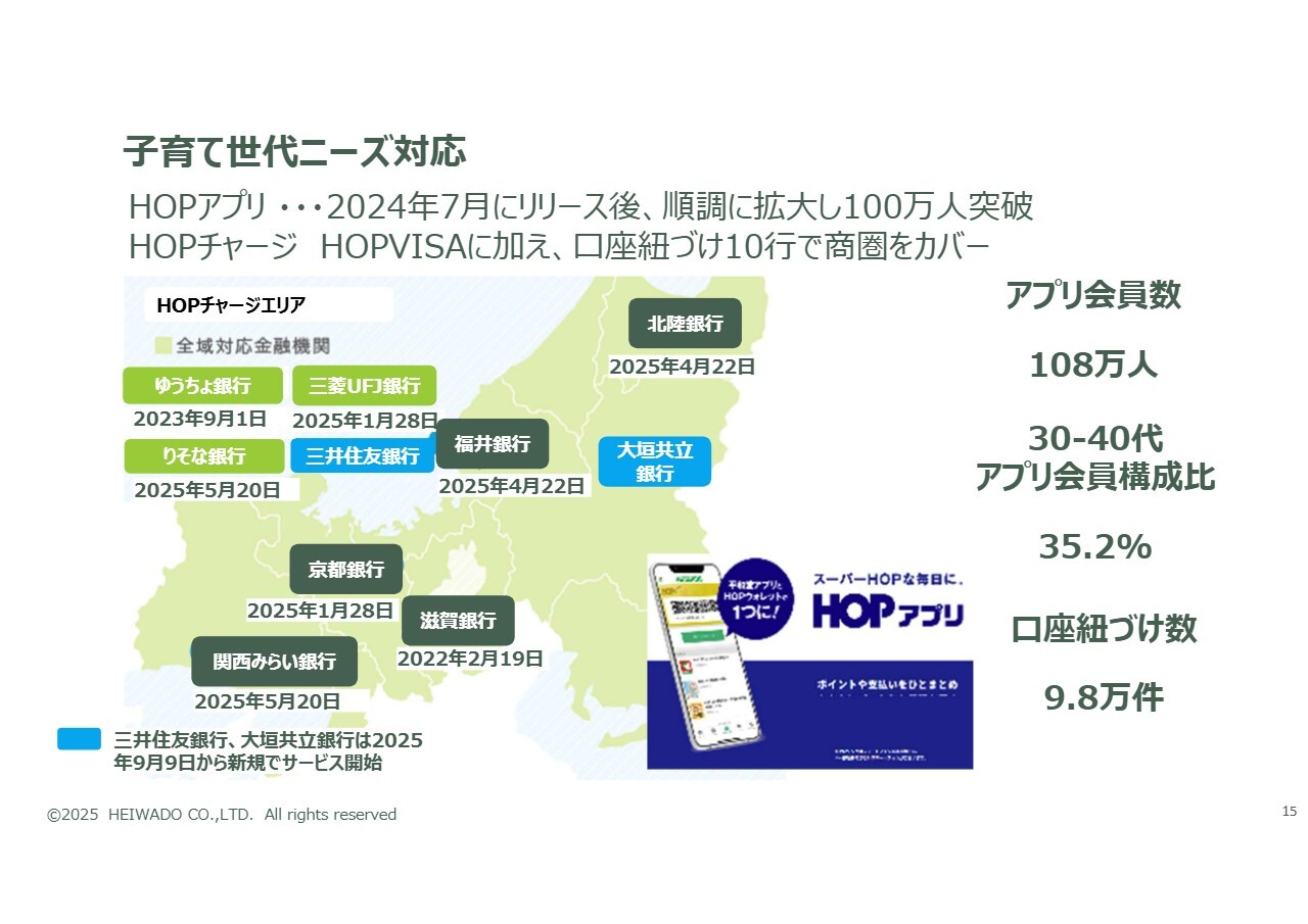 先ほどご説明した3つの重点戦略の1つ目、子育て世代のニーズ対応についてです。昨年7月に「HOPアプリ」をリリースしました。スライドに記載のとおり、アプリ会員数は100万人を突破しました。現時点ではすでに111万人を超えています。