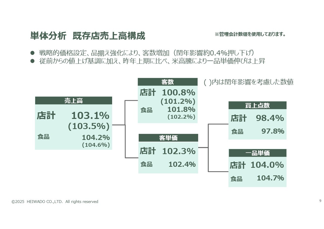 管理会計上の売上高は前期比105.1パーセント、既存店前期比も103.1パーセントといずれも伸びています。この数字には、昨年が閏年で1日多かったことによる影響が約0.4パーセント含まれています。