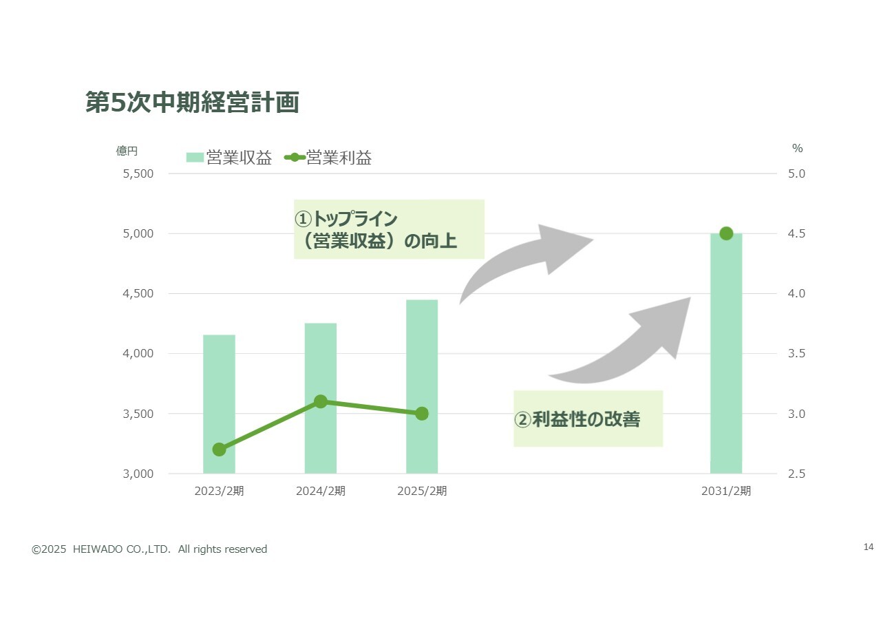 この目標を達成するために、まず「第5次中期経営計画」における2024年度から2026年度までの3年間を重要な期間と位置づけ、我々の中核となる小売事業でトップラインを確実に伸ばしつつ、収益面の向上も図る方針で取り組んでいます。