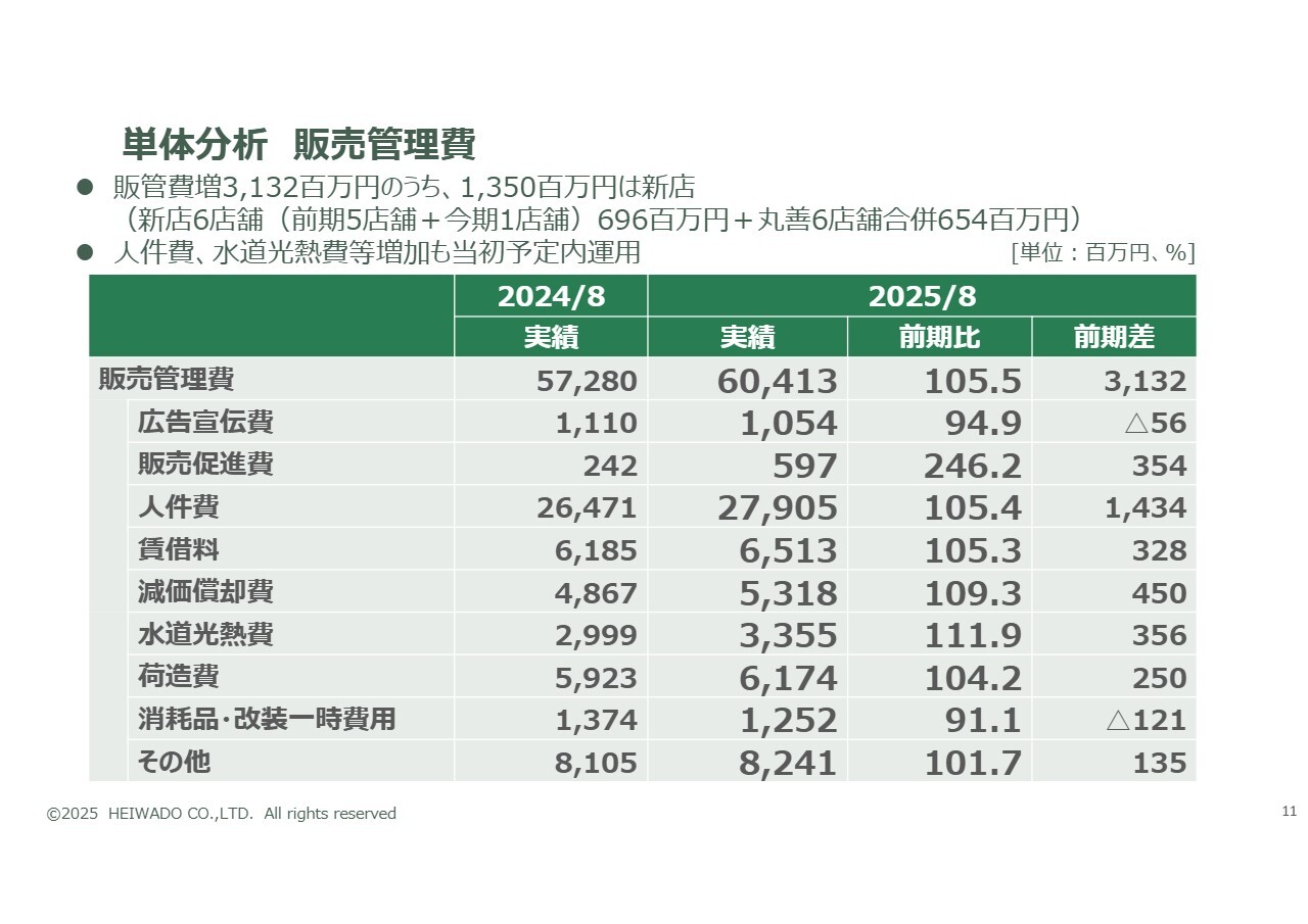 項目別に見ると人件費が前期比105.4パーセント、水道光熱費が前期比111.9パーセントといずれも増加していますが、これらは当初予定の範囲内の運用です。販売管理費全体については、当初立てた計画の範囲内でコントロールできている状況です。