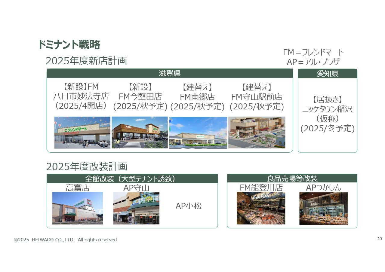 年度初めにスライド上段の4店舗の新店についてご説明しました。これらはいずれも滋賀県にあります。昨年は愛知県の店舗が多かったのですが、今年は滋賀県が多くなっています。なお、「フレンドマート南郷店」と「フレンドマート守山駅前店」の2店舗は建て替えによる新店です。