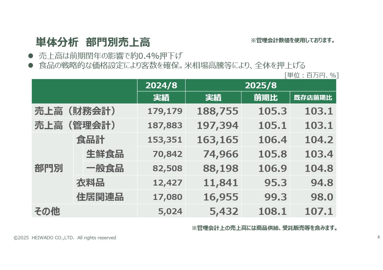 食品部門は既存店前期比104.2パーセントと大きく伸びています。一方、衣料品部門は既存店前期比94.8パーセント、住居関連品部門は既存店前期比98パーセントと、いずれも100パーセントを下回っています。