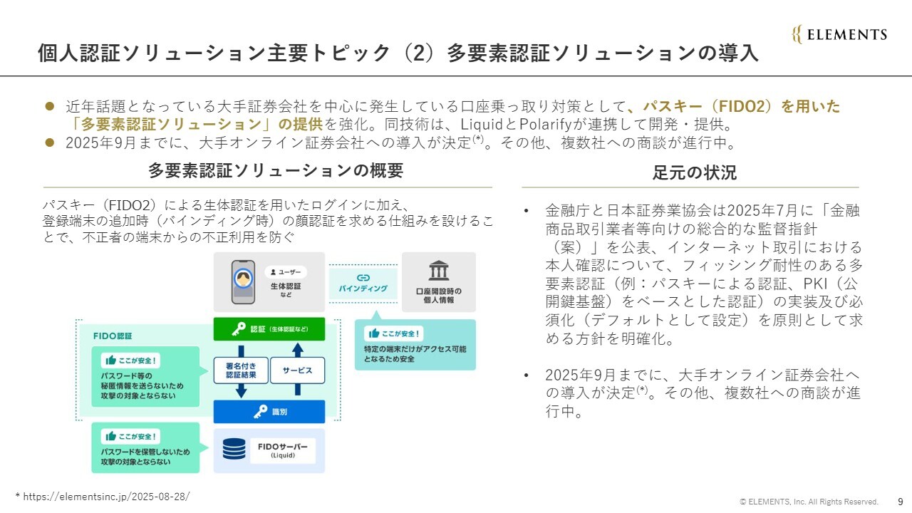 個人認証ソリューションとしての「多要素認証ソリューション」についてお話しします。こちらは冒頭で軽く触れた内容ですが、2025年4月から5月にかけて、証券会社で5,000億円から6,000億円ほどの被害が発生しました。この被害に関して、弊社の「多要素認証ソリューション」一式を当時導入していただいていれば、その被害を完全に防ぐことができたと断言できると考えています。