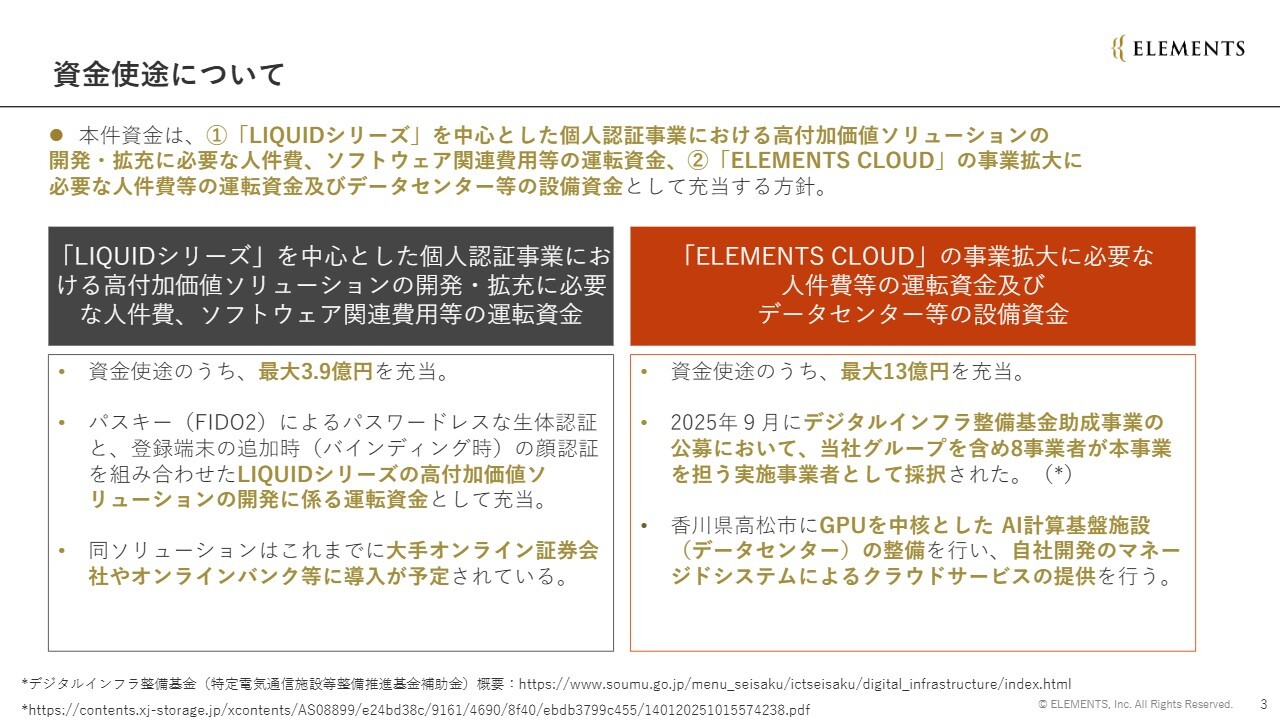 本件資金は、「LIQUIDシリーズ」を中心とした個人認証事業における高付加価値ソリューションの開発・拡充に必要な人件費やソフトウェア関連費用などの運転資金に充てることが1点目です。2点目としては、「ELEMENTS CLOUD」の事業拡大に必要な人件費などの運転資金およびデータセンターなどの設備資金に充当する方針です。