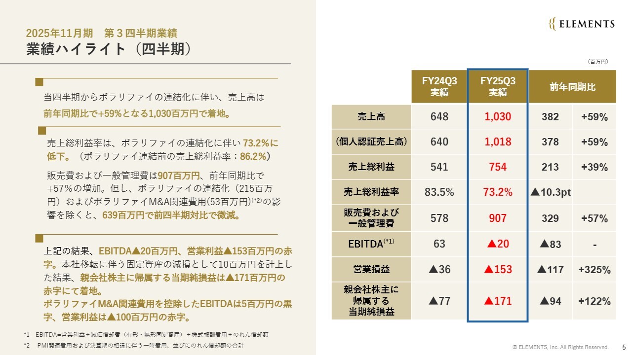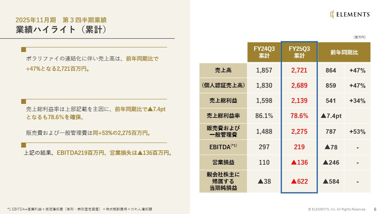 長谷川敬起氏:みなさま、こんばんは。株式会社ELEMENTS代表取締役社長の長谷川です。本日はお忙しい中、当社の決算発表にお越しいただき、誠にありがとうございます。これより、株式会社ELEMENTSの2025年度11月期第3四半期決算説明を開始します。