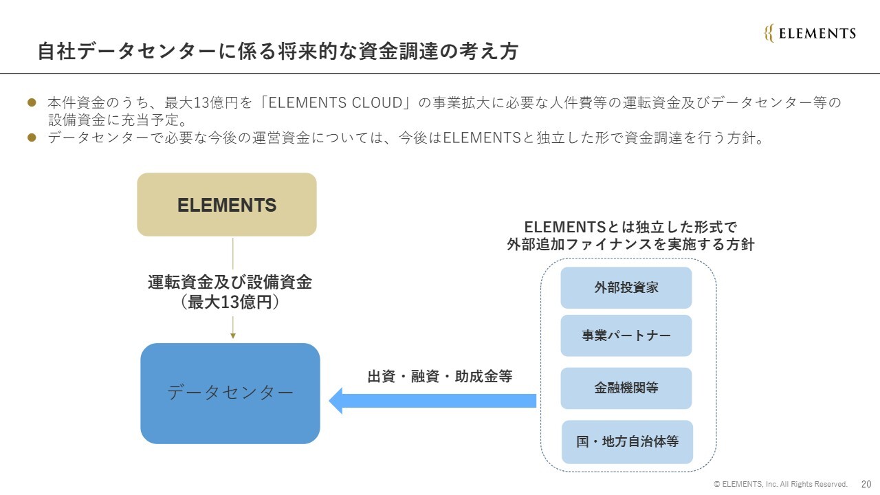これ以外に補助金がありますが、補助金とELEMENTSから出す最大13億円以外にも必要となる運転資金およびデータセンターに関わる設備資金に関しては、今後、ELEMENTSと独立した形式で外部からの追加ファイナンスを実施する予定です。