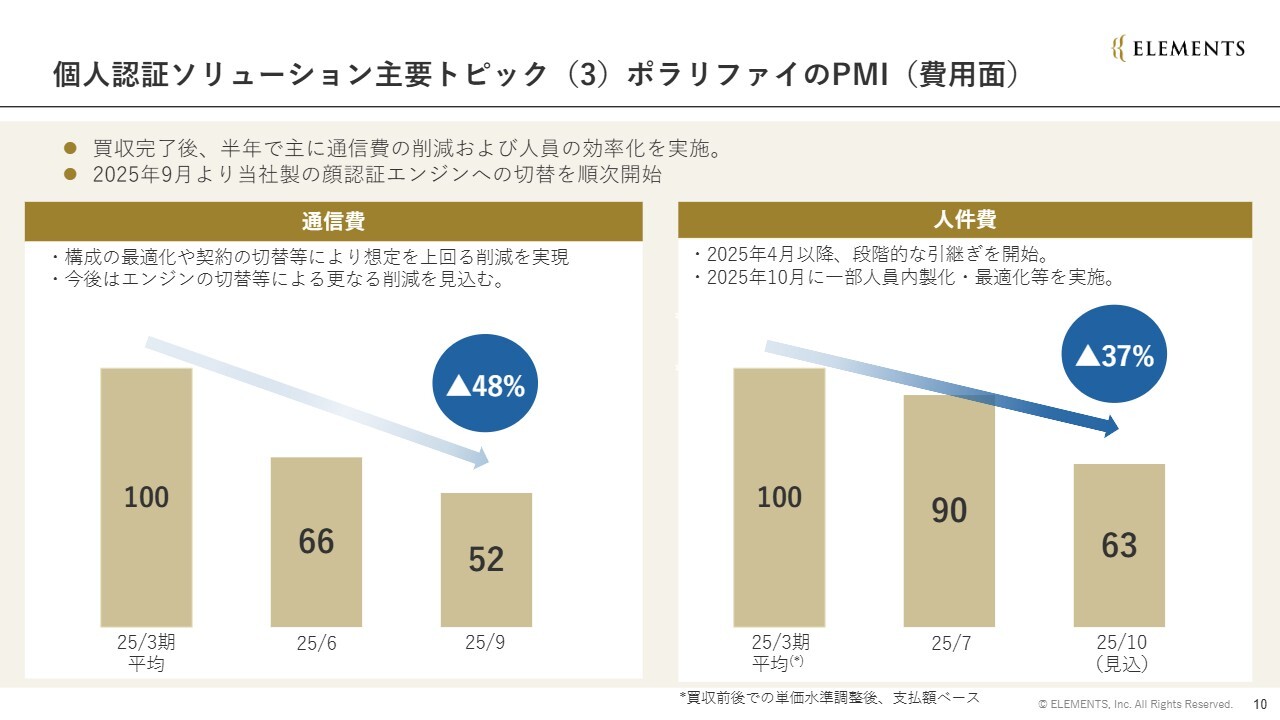 通信費に関しては、買収時の費用に対して現時点で約50パーセントのコスト削減を実現しており、当初の買収計画を上回る早さで、前倒しでコスト削減が進んでいます。