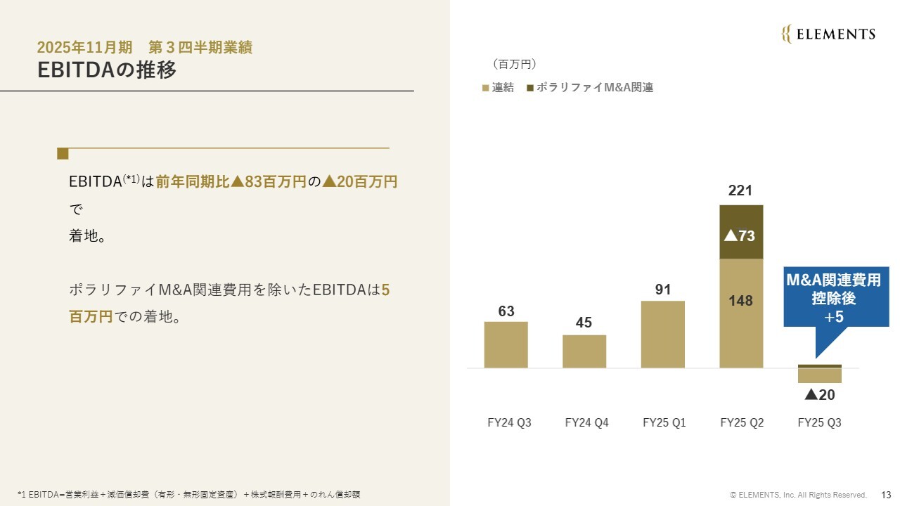 営業利益はポラリファイ社の連結会社化の影響により、1億5,300万円の赤字となり、EBITDAも2,000万円の赤字となっています。また、ポラリファイ社のM&A関連費用を控除した場合のEBITDAは、500万円の黒字を維持しています。