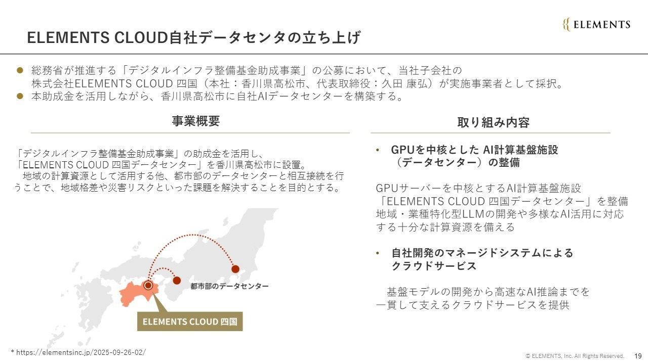 冒頭の話と重複しますが、総務省が推進する「デジタルインフラ整備基金助成事業」の公募において、当社子会社であるELEMENTS CLOUD 四国が事業者として採択されています。ELEMENTS CLOUD 四国は、自社データセンターを運営する子会社です。