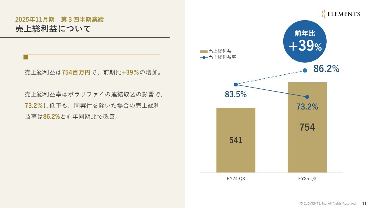 売上総利益率は、ポラリファイ社の連結化により一時的に73.2パーセントに低下しています。一方、ポラリファイ社連結前の売上総利益率は86.2パーセントでした。