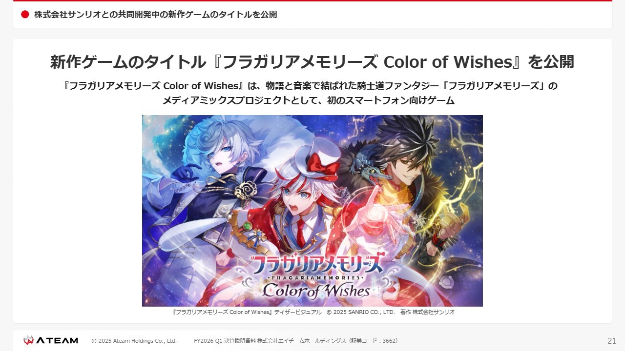 3つ目のトピックです。エンターテインメント事業において、株式会社サンリオとの協同開発中の新作ゲームのタイトル「フラガリアメモリーズ Color of Wishes」を公開しています。
