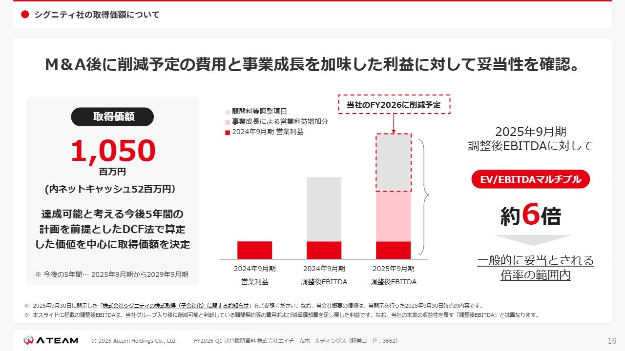 回答:シグニティ社の2024年9月期の営業利益は2,100万円ですが、この中にはM&A実施後には削減予定となる費用が含まれています。また、2025年9月期に事業が成長しており、M&A後に削減予定の費用を調整した2025年9月期における最新の調整後EBITDAに対して、EV/EBITDAマルチプルは約6倍となっています。この倍率は一般的に妥当な範囲内であり、当社としては本M&Aに関する取得価額の妥当性を確認しています。