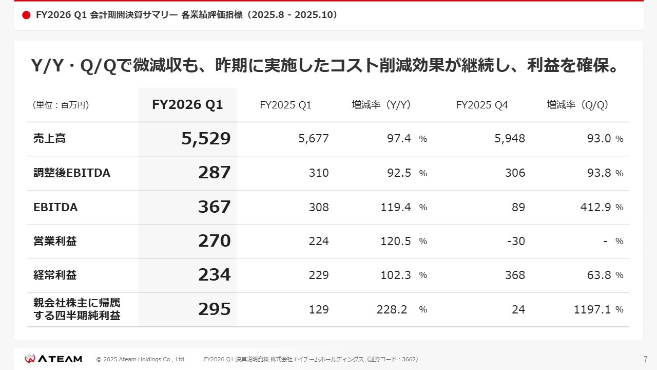 FY2026 Q1 会計期間決算サマリー 各業績評価指標(2025.8-2025.10)