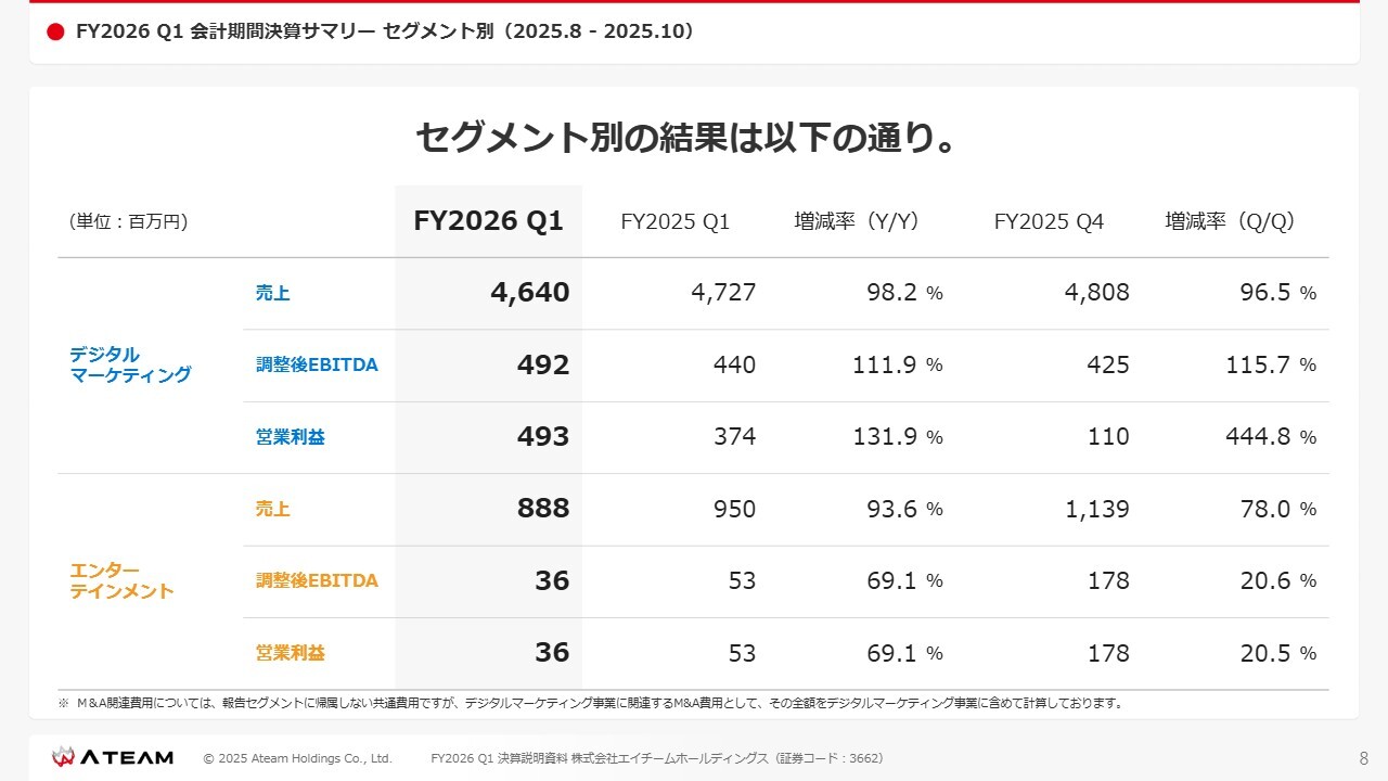 FY2026 Q1 会計期間決算サマリー セグメント別(2025.8-2025.10)