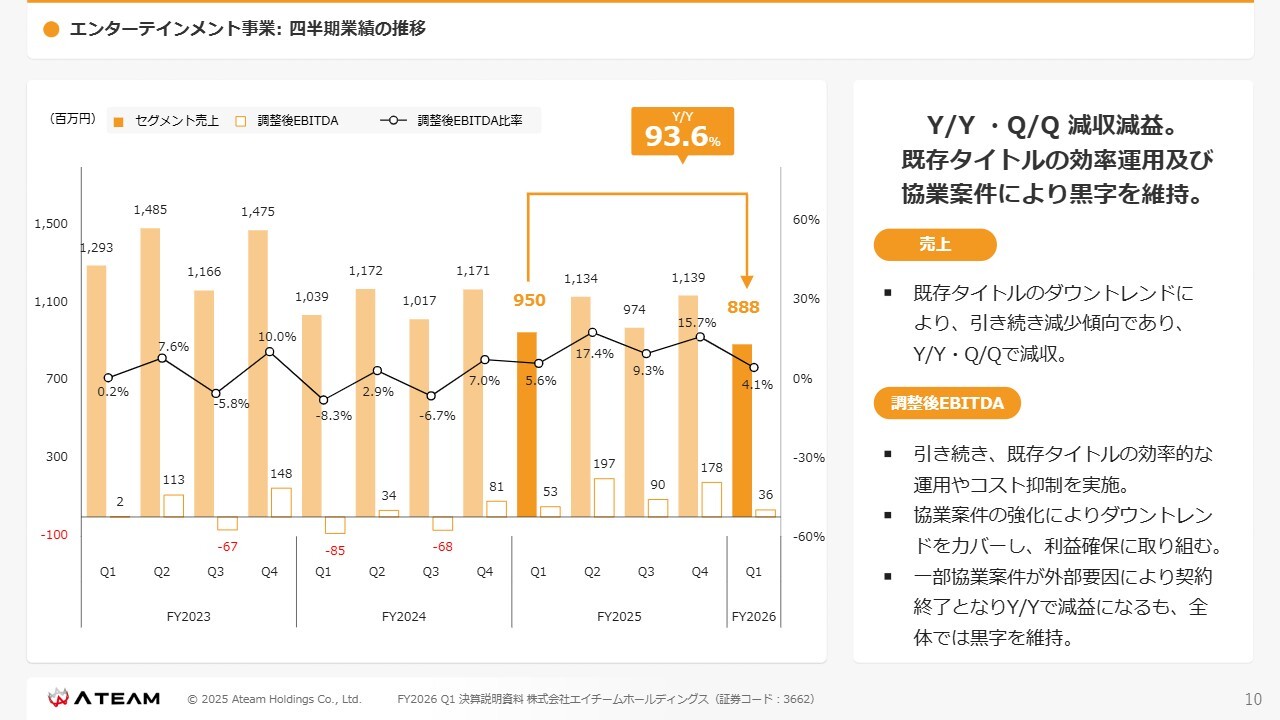 エンターテインメント事業では、既存タイトルの効率的な運用と協業案件により黒字を維持しています。既存タイトルは引き続きダウントレンドにありますが、減少幅はかなり小さいと捉えています。