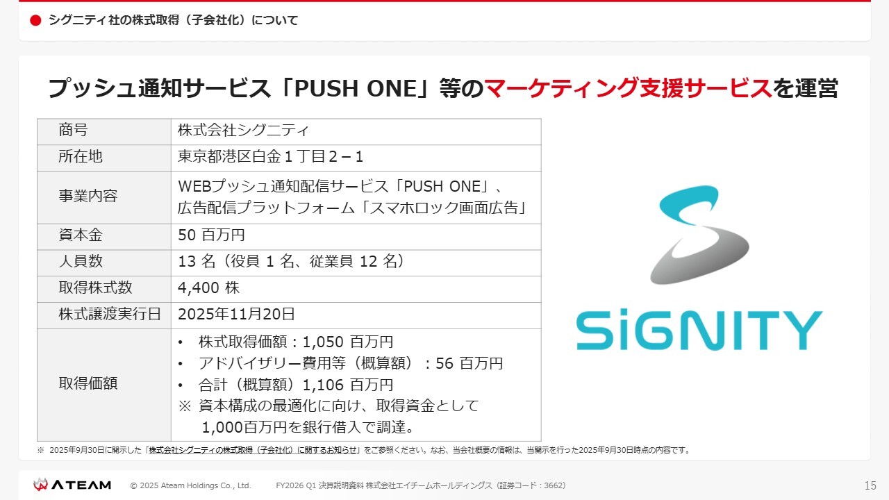 1つ目のトピックであるシグニティ社についてですが、スライドに記載のとおり、社員数は13名で、株式取得価額は10億5,000万円です。この資金については、資本構成の最適化を意識し、銀行借入で賄っています。