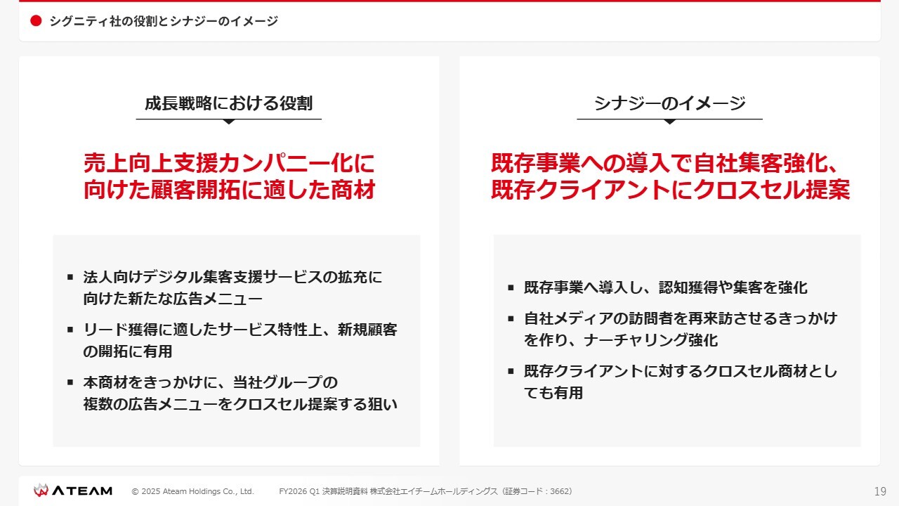 我々のシナジーのイメージについてですが、スライドの左側に記載しているとおり、今後、売上向上支援カンパニー化に向けて、新たなお客さまを開拓する際に非常に販売しやすい商材だと考えています。